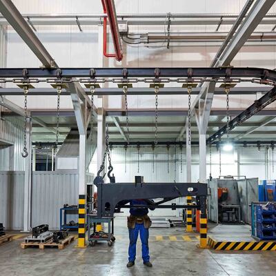 As demonstrated in our facility, the robust drop chains and custom-designed load hooks can safely and smoothly transport workpieces weighing several tons, keeping the floor space entirely clear and eliminating the need for cumbersome ground trolleys.